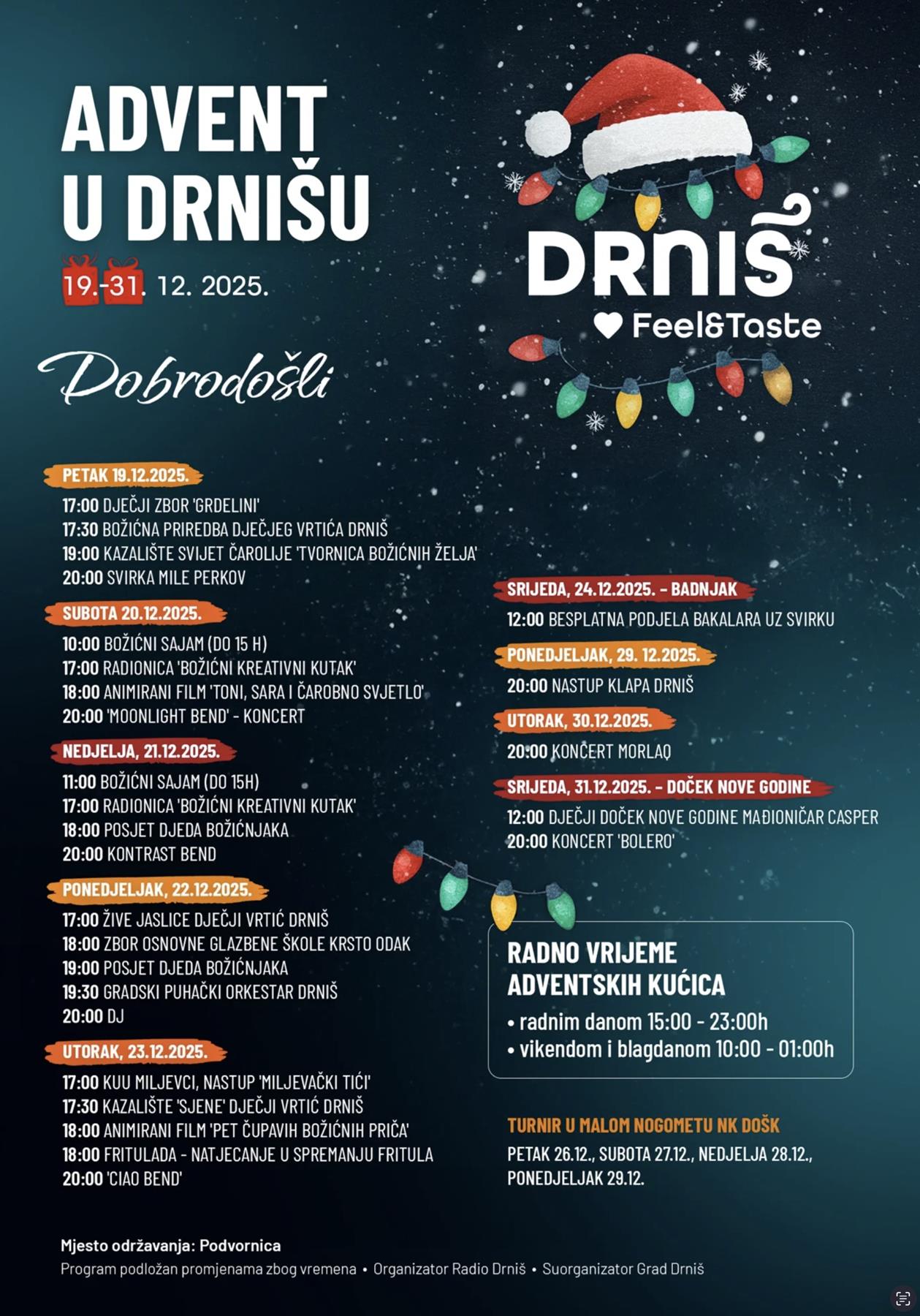 Drniš će od 19. do 31. prosinca živjeti u blagdanskom ritmu jer Advent u Drnišu i ove godine pretvara park Podvornicu u mjesto susreta, veselja i toplog božićnog ugođaja. Posjetitelje očekuju brojni dječji nastupi, priredbe, božićni sajam i raznolike kreativne radionice koje potiču maštu najmlađih. Na programu će se naći i kazališne predstave te crtići, dok će najmlađe posebno razveseliti posjeti Djeda Božićnjaka. Parkom će odzvanjati glazba jer nastupaju klape, dječji zborovi, Gradski puhački orkestar Drniš te brojni bendovi. Poseban dio programa uključuje žive jaslice, tradicionalnu besplatnu podjelu bakalara na Badnjak te popularnu „Frituladu“.
